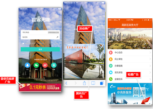政務(wù)內(nèi)容精準(zhǔn)投放功能,可以在不同區(qū)域推送不同的內(nèi)容,比如公積金管理中心推送貸款廣告,行政服務(wù)中心推送市政信息,交管局推送車輛保險廣告等等。廣告直達(dá)最終用戶,是離用戶最近而且具有說服力的廣告展示平臺。